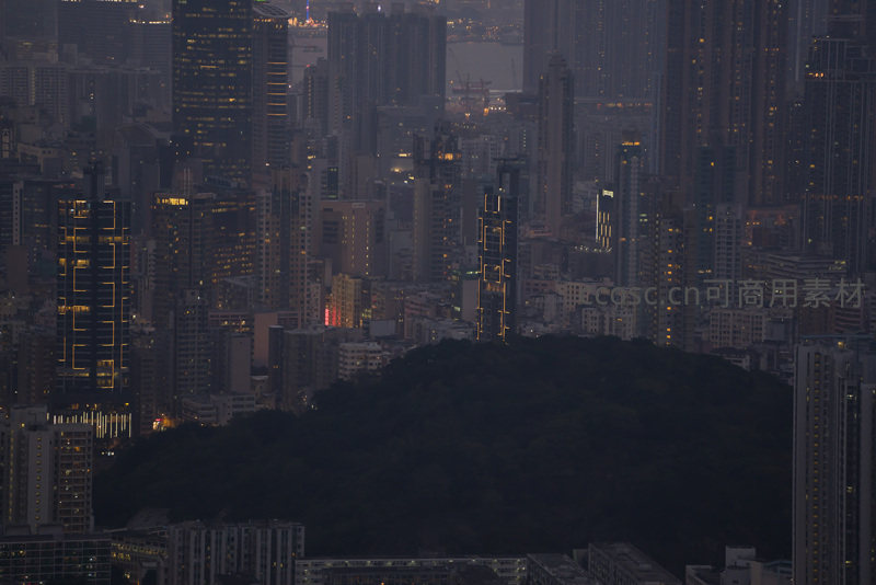 航拍视角下,葱郁山丘静卧于密集高层建筑环抱之中,部分楼宇外立面亮起金色灯带,形成自然与人工强烈对比,凸显高密度城市中的绿色肺叶与空间韧性。