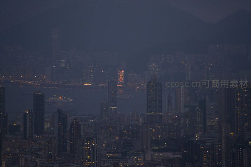 薄雾笼罩下的维港对岸,天际线隐于暮霭,游轮穿行如星火闪烁