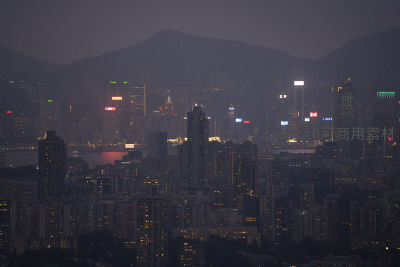 高角度俯瞰香港岛北部城区,远山被暮色与轻雾笼罩,城市密集楼宇中点缀着五彩霓虹招牌与暖黄窗灯;维港水面隐约可见船影,整体画面呈现低饱和度冷调,营造出宁静又神秘的东方都市夜韵。