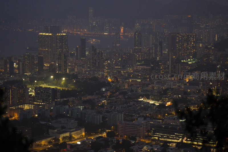 从高处俯瞰香港夜景,维多利亚港两岸摩天大楼灯火通明,中环金融区与九龙密集住宅区交相辉映,远处山峦轮廓朦胧,雾气轻笼城市,展现国际都市的繁华与静谧并存之美。