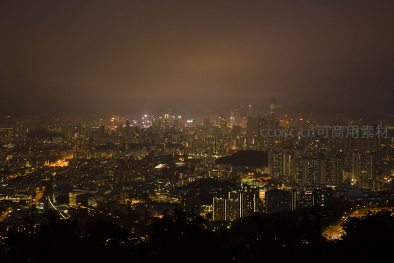 从暮色过渡至深夜,天空残留橙褐余晖,城市灯光逐步点亮,道路车流形成流动光轨,远山与海面融入暗调背景,整体画面兼具诗意与现代感,记录城市昼夜交替的瞬息韵律。