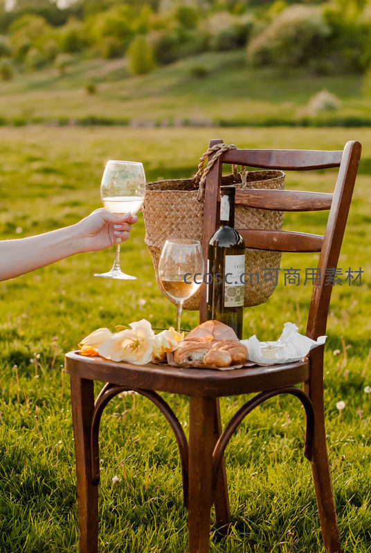 绿意盎然的田野中,深色木椅搭设简易野餐台,酒瓶、两杯白葡萄酒、羊角面包与白色花朵错落摆放,一只手轻举酒杯互动,背景虚化山丘,尽显法式浪漫。