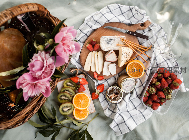 俯拍视角下,藤编野餐篮盛放面包与粉牡丹,木质砧板陈列多种奶酪、切片橙子、草莓、猕猴桃及果酱罐,格纹餐巾铺陈其上,营造清新自然的户外美食氛围。
