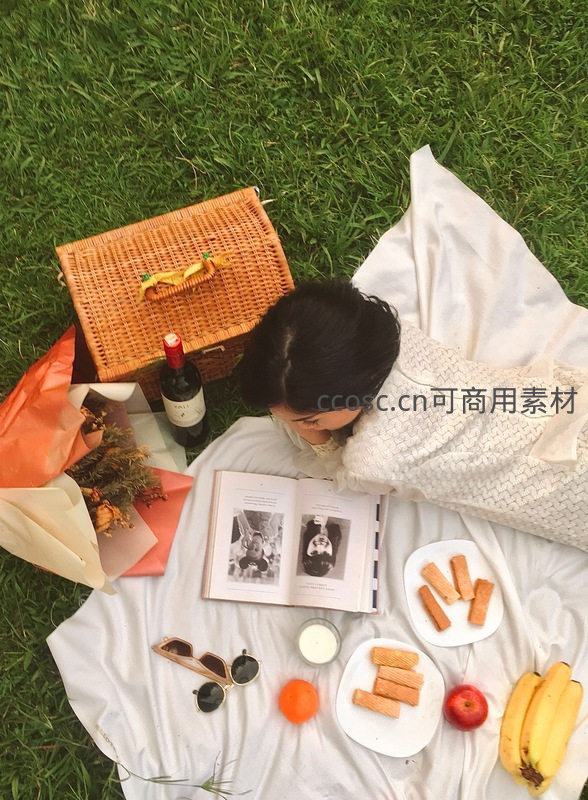俯视镜头捕捉一位女子侧卧于白布上专注阅读老照片书页,身旁藤编野餐篮、红酒瓶、水果盘与干花束错落有致,阳光洒落草叶间,传递宁静治愈的慢生活美学与文艺气息。