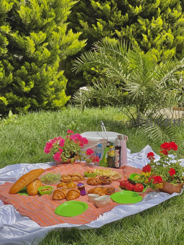 绿荫下的法式野餐:羊角面包、番茄与盆栽花卉的色彩盛宴