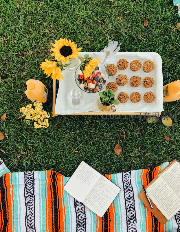 航拍视角展现草地野餐场景:木托盘盛放燕麦饼干、水果沙拉与小盆栽,旁置向日葵、橙汁瓶及摊开的手写笔记本,彩色条纹毯延伸至画面下方,充满春日活力与文艺气息。