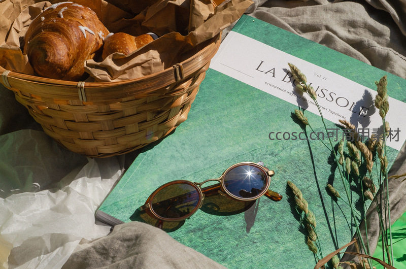 微距特写呈现阳光下的早餐静物:藤编篮内盛放糖霜牛角包,旁为绿色封面《LA BUISSOLE》杂志、复古圆框墨镜与干麦穗,亚麻布褶皱衬底,光影柔和,质感温暖自然。
