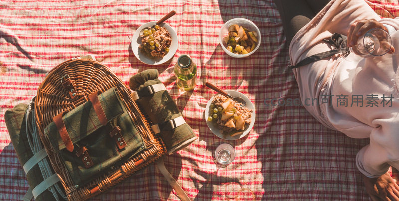 俯视角度捕捉红白格纹野餐垫上的温馨场景:复古藤编野餐篮旁摆放三碗水果燕麦、玻璃瓶饮料与酒杯,人物侧卧持杯,阳光斜照投下斑驳影子,传递慢节奏、自然治愈的周末休闲感。