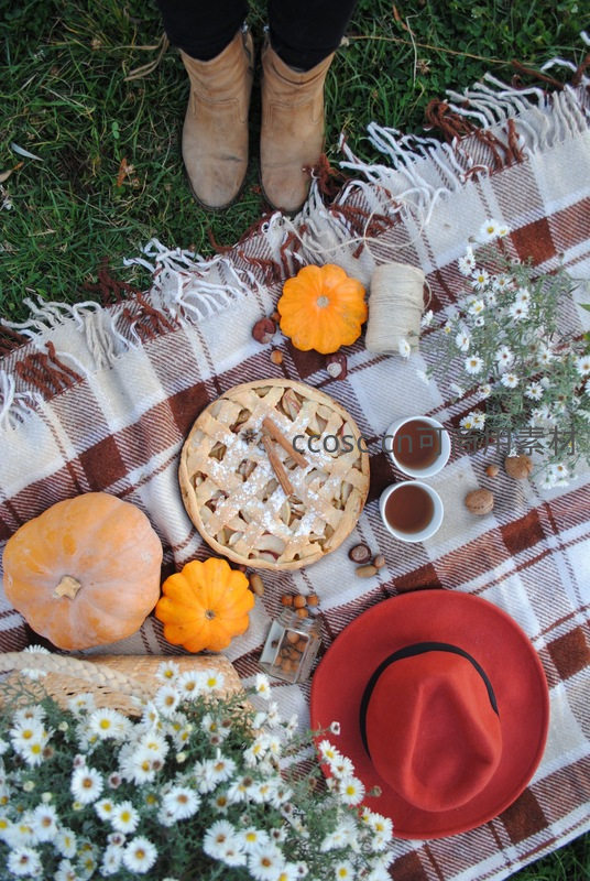 秋日草坪野餐:格纹毯上的苹果派、南瓜与红色礼帽