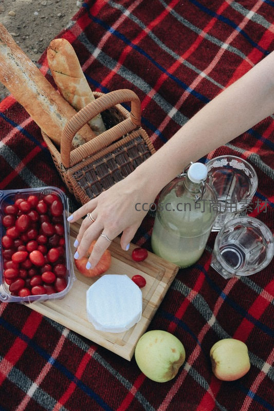 格纹毯上的法式野餐:手取小番茄,面包奶酪与青苹果静物