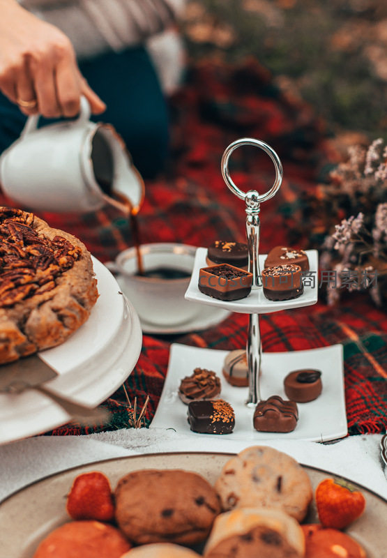 暖色调秋日野餐场景,一只手正将咖啡缓缓倒入杯中,三层甜点架陈列各式巧克力甜点,背景是红黑格子毯与干花,充满惬意与质感。