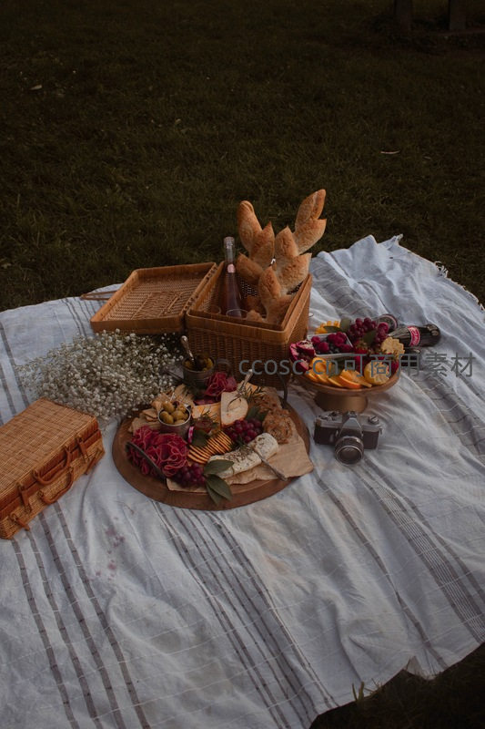复古野餐篮盛宴:法棍奶酪与鲜花的田园仪式
