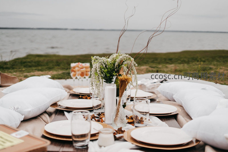 临湖草地上设长木桌,铺米色亚麻布,配白色蓬松枕垫营造舒适感;中央插瓶以干枝与小白花为饰,搭配金边瓷盘、透明玻璃杯与散落干叶,远处湖面辽阔,整体风格极简而富有仪式感。
