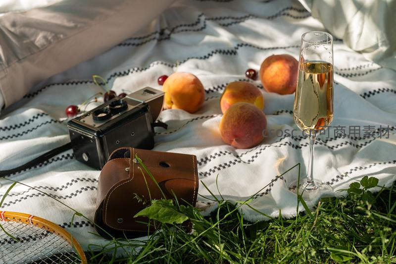 草地野餐布上的桃子香槟与胶片相机,柔光浪漫静物
