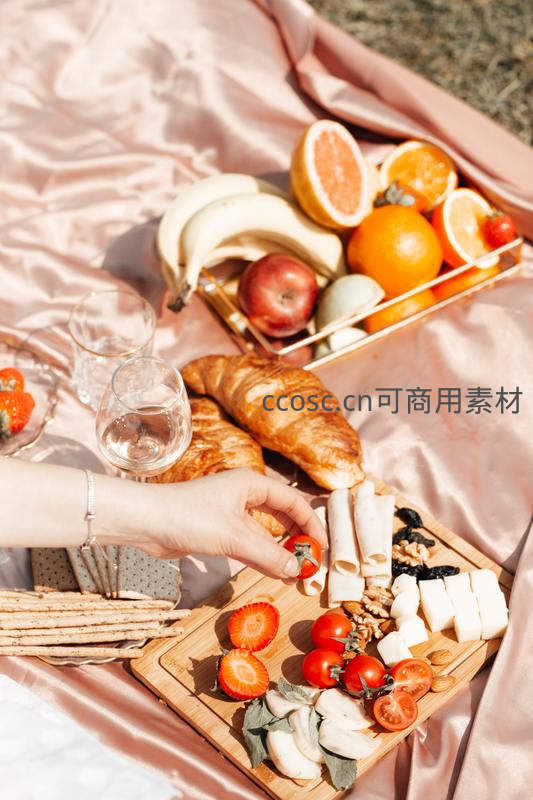 粉色丝巾野餐布上的精致水果面包拼盘特写