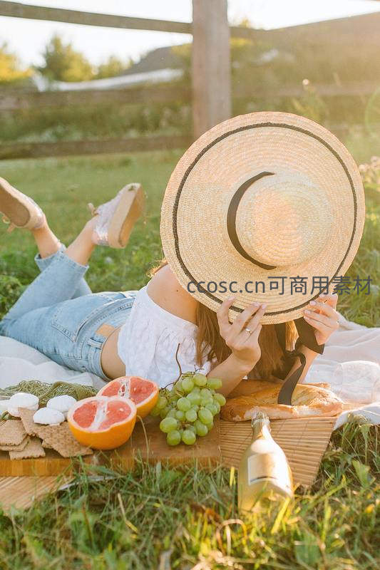 草帽遮面女子躺卧草地野餐场景自然光摄影