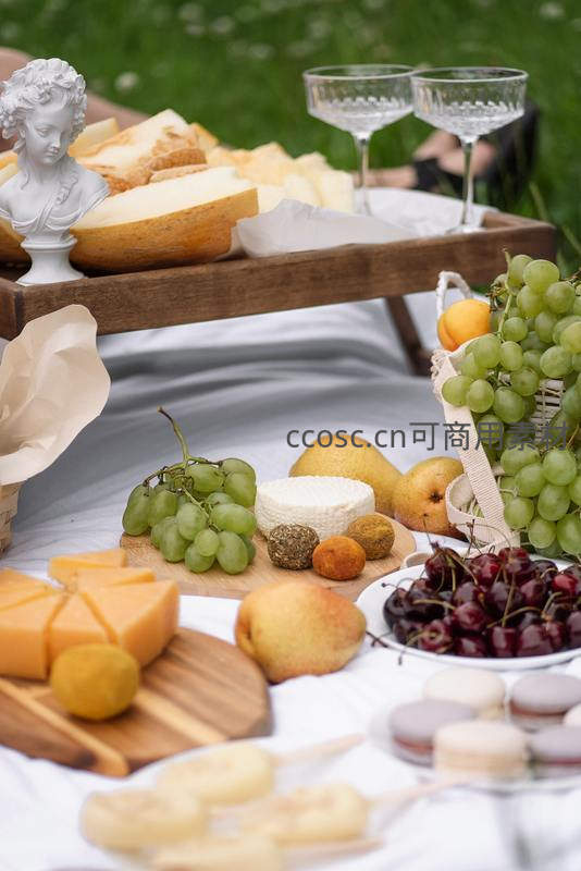 丰盛奶酪拼盘野餐:葡萄、樱桃、梨与古典雕塑点缀的法式风情