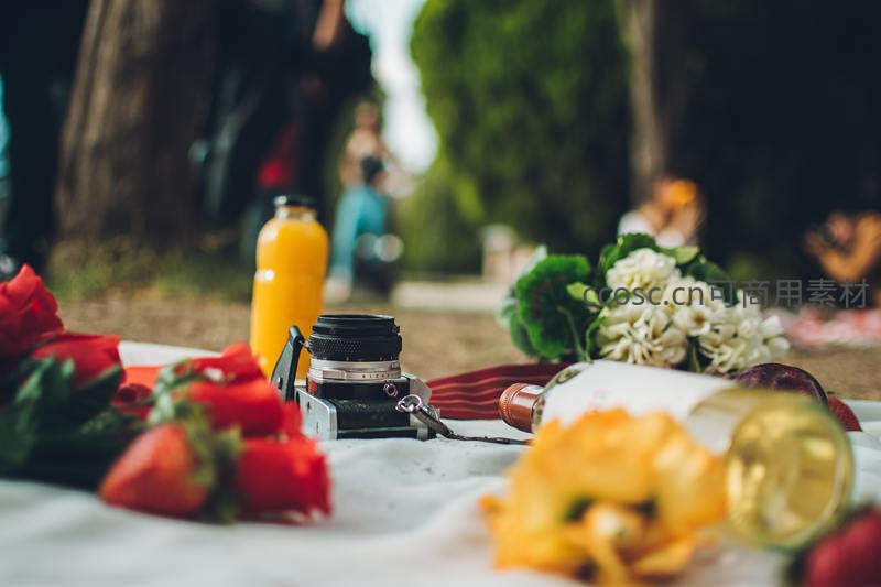 复古胶片相机与鲜花橙汁的野餐角落,虚化人群中的文艺气息