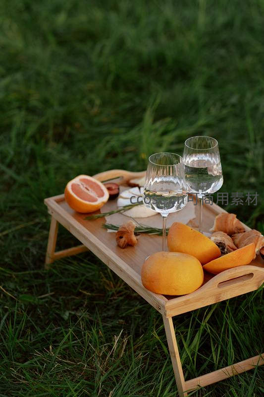 木质托盘上的精致野餐摆盘:葡萄柚、奶酪、红酒与酥点