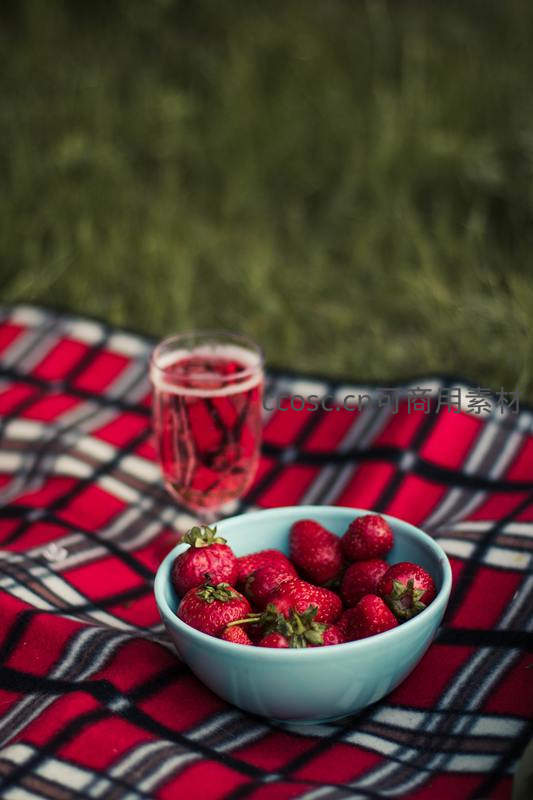 微距视角下,浅青色陶瓷碗中堆满饱满鲜红草莓,绿蒂清晰可见;后方透明玻璃杯盛有泛着气泡的红色饮品,置于红黑格纹野餐毯上;背景虚化绿草,整体色调明快,突出夏日水果的诱人与清凉感。