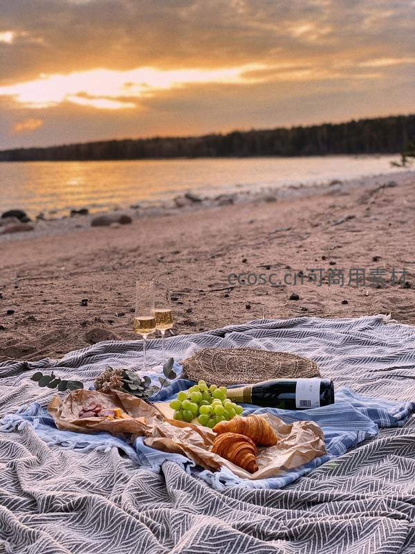 湖畔日落野餐布上香槟葡萄羊角面包,远山倒影如画宁静致远