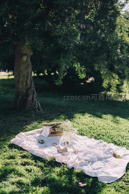 粗壮松树 trunk 投下浓密阴影,白色布巾随意铺陈于翠绿草坪,藤篮中插着干花,散落青果与纸片,柔和逆光营造出宁静治愈的午后休憩氛围。
