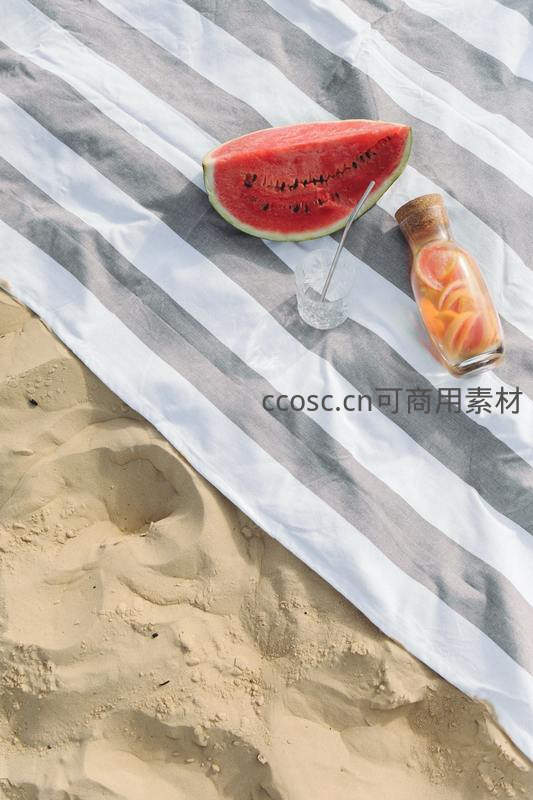条纹野餐垫上西瓜切片与柑橘饮品夏日清凉特写