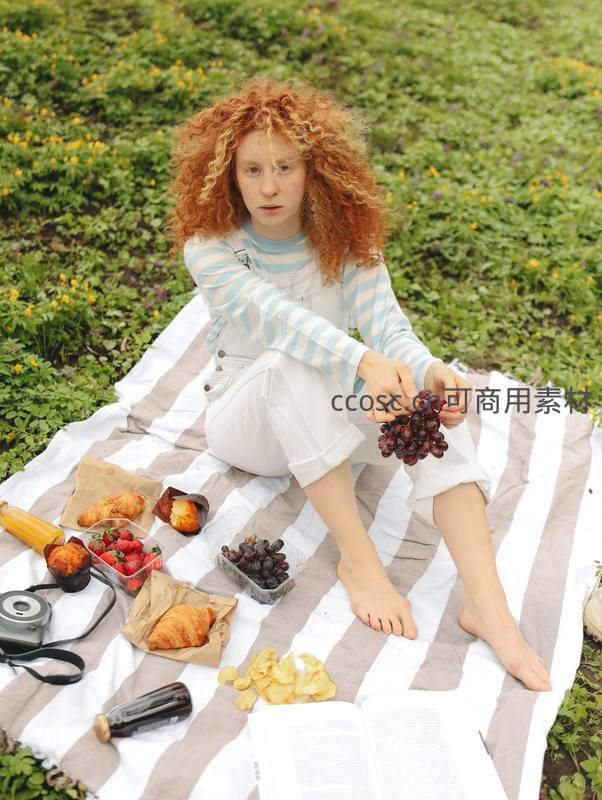 红发少女草地野餐手持葡萄凝视镜头自然随性