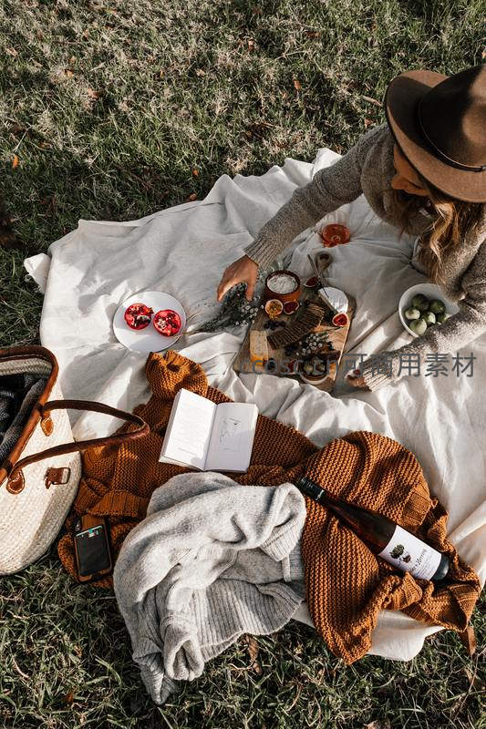 女子戴宽檐帽、穿针织毛衣,俯身整理白色亚麻野餐布上的食物:切开的石榴、奶酪拼盘、小碗果酱与一本摊开的书,身旁放草编包与酒瓶,尽显秋日慵懒诗意。