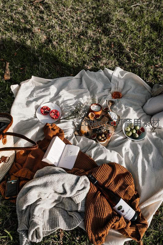 阳光斜照在铺开的米白色亚麻野餐布上,散落着打开的书本、酒瓶、石榴切片、小碟橄榄与坚果,橙灰针织衫随意搭放,传递出宁静、文艺且充满生活气息的秋日休憩画面。