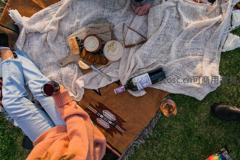 草坪野餐俯拍:红酒奶酪与毛毯的悠闲午后时光