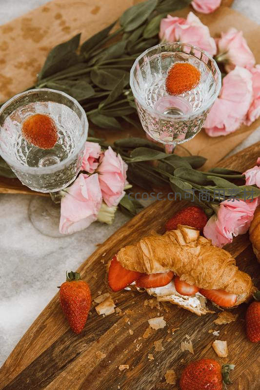 水晶杯中浮着鲜红草莓,旁置切开的奶油可颂夹满草莓片,粉色郁金香与绿叶点缀木质托盘,碎屑散落,光影柔和,尽显春日甜蜜仪式感。