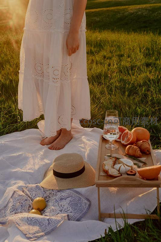 夕阳下白色蕾丝长裙女子草地野餐静谧时光