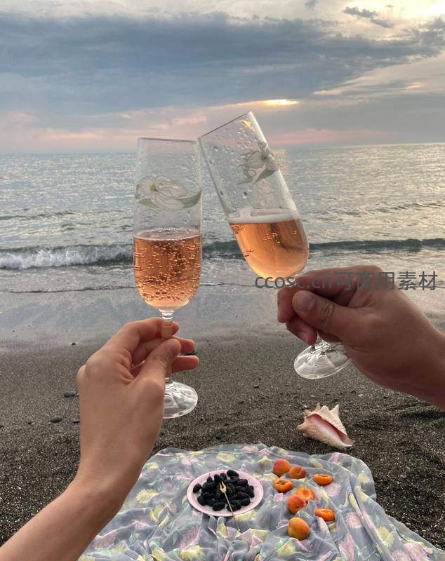 海边日落碰杯:两支香槟杯相碰,共享黑莓与杏桃野餐