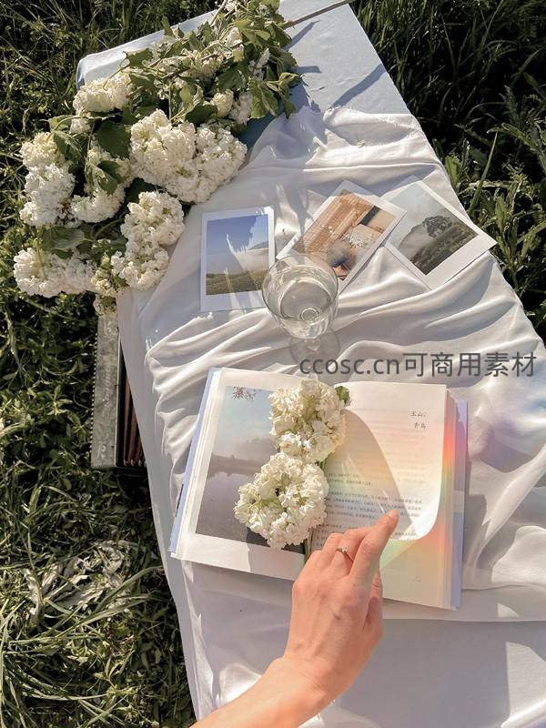 白色绣球花束散落于柔滑白绸布上,一本打开的书页被手指轻触,旁边摆放拍立得照片与水晶杯;阳光透过叶片洒下斑驳光影,彩虹光晕映在纸页边缘,呈现宁静治愈的户外阅读场景。