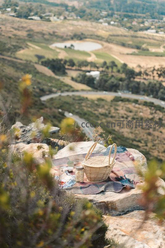 山崖野餐篮俯瞰山谷 vineyard 与蜿蜒公路