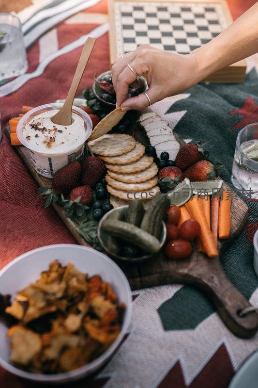 木质托盘上的精致野餐拼盘:奶酪、饼干、蔬果与蘸酱