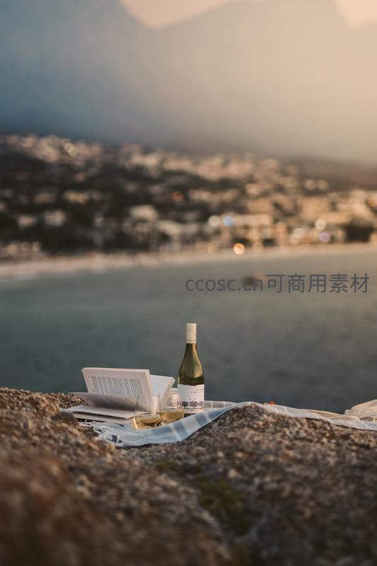 岩石高处野餐:白葡萄酒、书本与海岸小镇朦胧夜景
