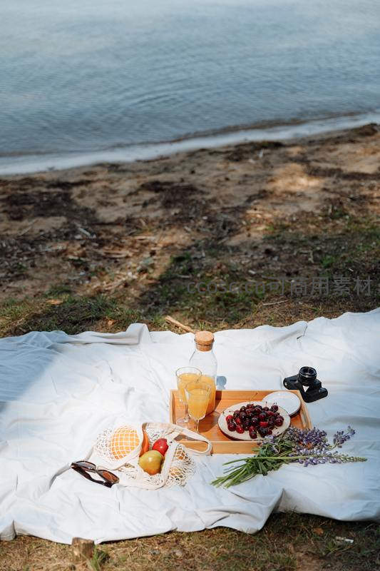 临水岸边铺展白色棉布,木托盘摆放樱桃、橙汁、水果网袋与墨镜;一束薰衣草点缀其间,远处湖水波光粼粼,枯草与沙岸过渡自然,整体风格清新文艺,充满慢旅行诗意。