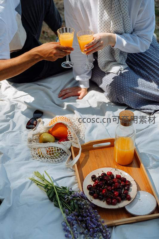 两人举杯共饮橙汁,野餐布上樱桃与鲜花相伴
