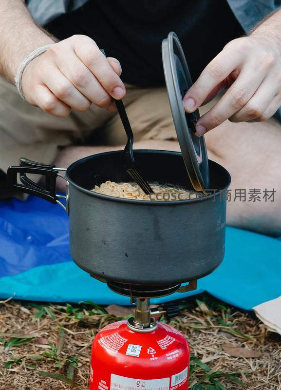 户外露营便携炉具煮面特写,红气罐与黑色锅具细节清晰