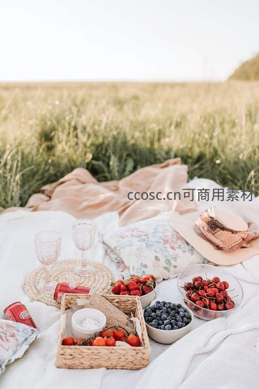 阳光洒落的田野中,白色野餐布铺展其上,摆放藤编篮、透明玻璃杯、盛满新鲜草莓、蓝莓与樱桃的瓷碗,搭配复古饮料罐与碎花靠枕,营造温馨惬意的郊游氛围。