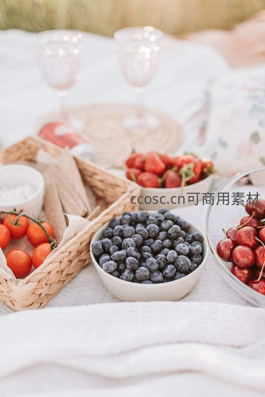 蓝莓特写居中构图,晶莹果粒与藤编篮、樱桃碗形成色彩层次
