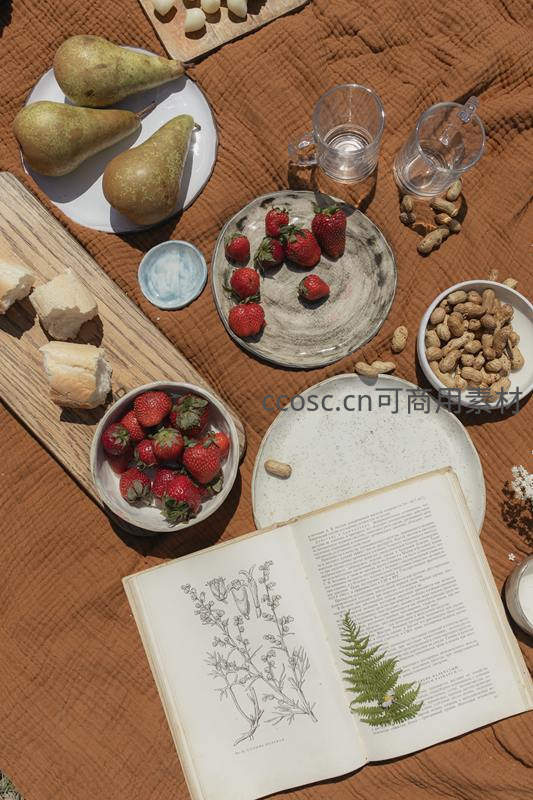 俯拍野餐拼盘:梨子草莓面包坚果与植物图鉴,橙褐布面质感丰富温馨