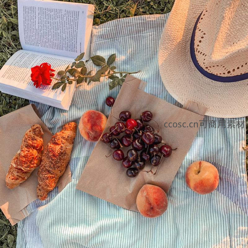 浅蓝白条纹棉布铺于草地,中央纸袋盛满鲜红樱桃,两侧桃子饱满多汁,两枚金黄羊角面包置于牛皮纸袋中,一本翻开的书上横卧一枝带叶红玫瑰,草帽斜放一角,光影柔和,诗意盎然。