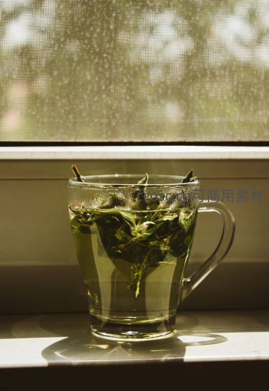 窗边玻璃杯中舒展的绿茶叶片,雨滴轻拂窗棂,光影斑驳静谧