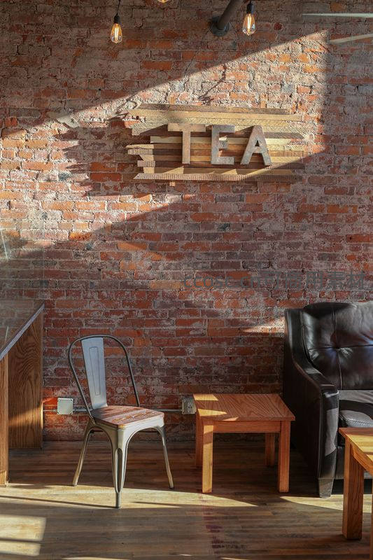 复古红砖墙上悬挂粗犷木制‘TEA’标识,阳光透过高窗投下几何光影,搭配做旧金属椅、原木小几与黑色皮质沙发,展现现代茶空间的粗粝与温暖并存的美学风格。