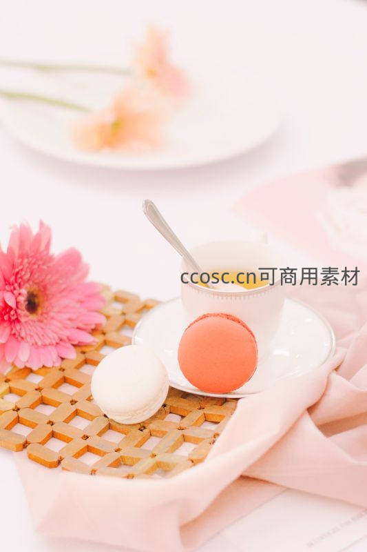 白色瓷杯盛淡黄茶汤,搭配橙白双色马卡龙置于竹编垫上;前景粉雏菊鲜艳夺目,背景虚化中隐约可见餐盘与布艺,整体色调温柔清新,传递悠闲惬意的午后时光与精致生活仪式感。