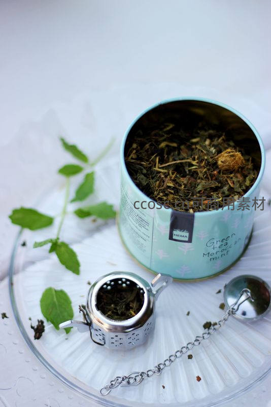 薄荷绿茶叶罐开盖特写,散落干叶与金属茶滤置于玻璃盘上,清新自然