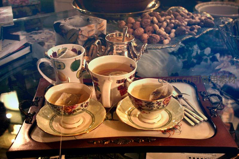 复古茶具静物组合:彩绘瓷杯盛茶,银壶坚果盘映衬怀旧下午茶时光